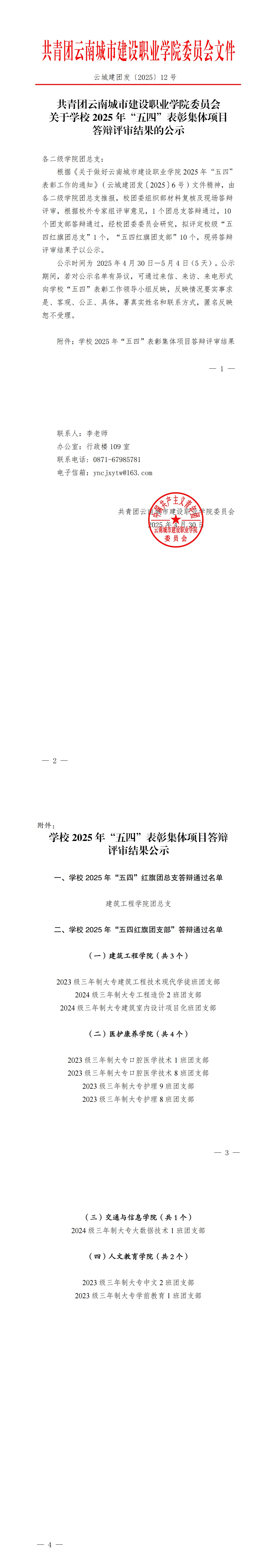 云城建团发〔2025〕12号 共青团云南城市建设职业学院委员会关于学校2025年“五四”表彰集体项目答辩结果的公示