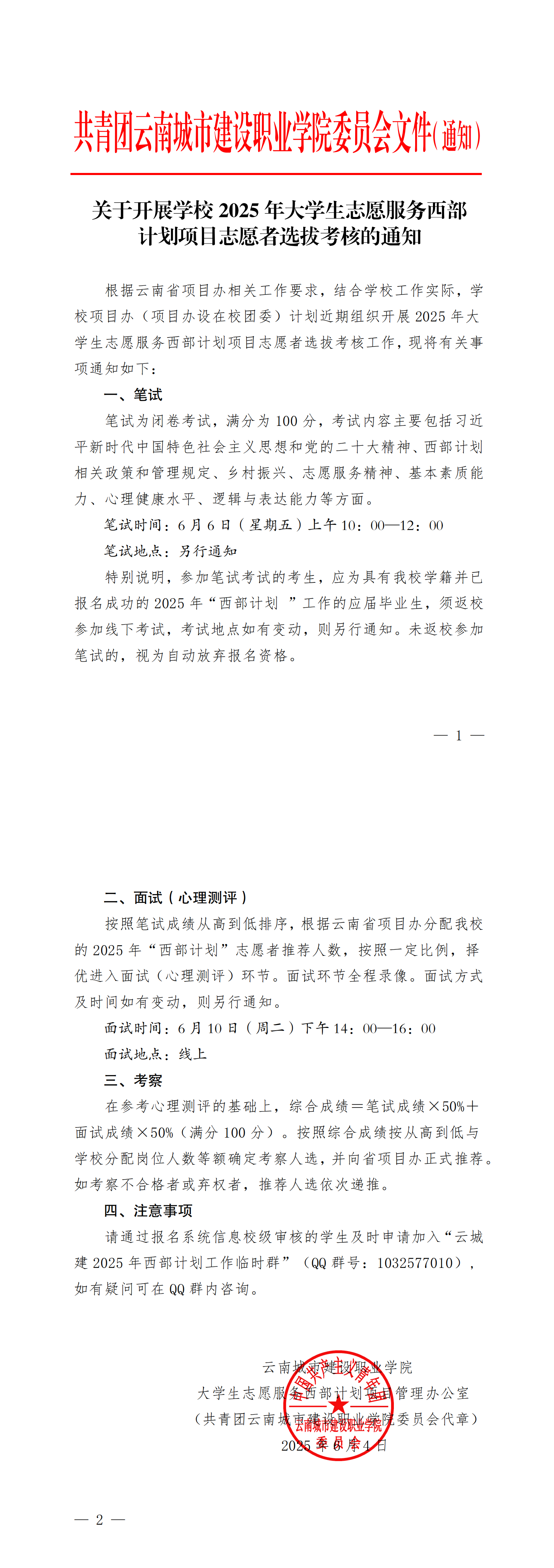 关于开展学校2025年大学生志愿服务西部计划项目志愿者选拔考核的通知