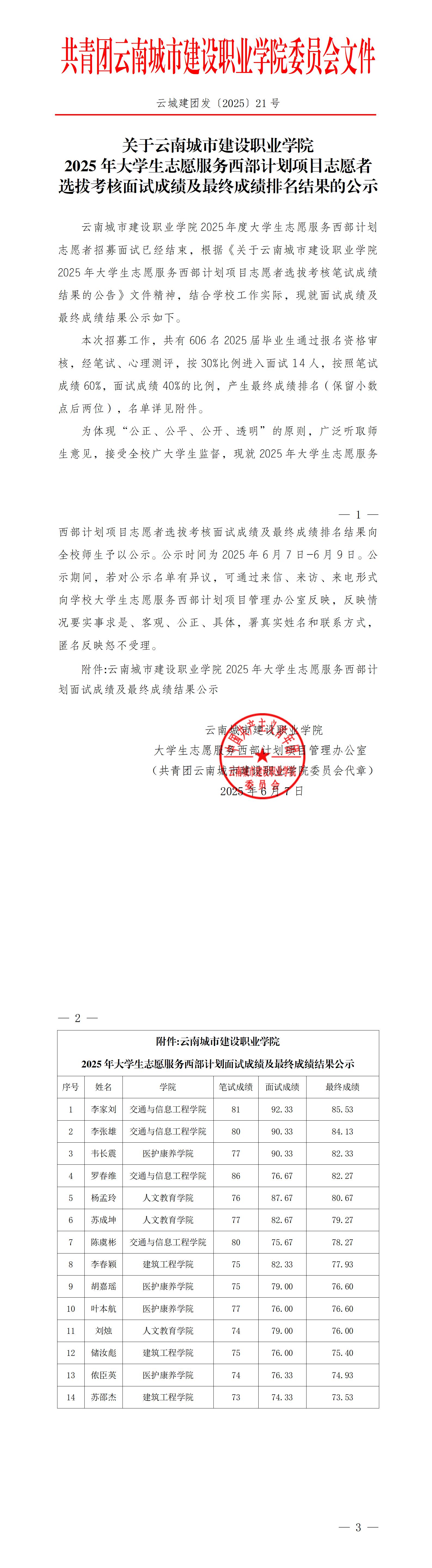云城建团发〔2025〕21号关于云南城市建设职业学院2025年大学生志愿服务西部计划项目志愿者选拔考核面试成绩及最终成绩排名结果的公示