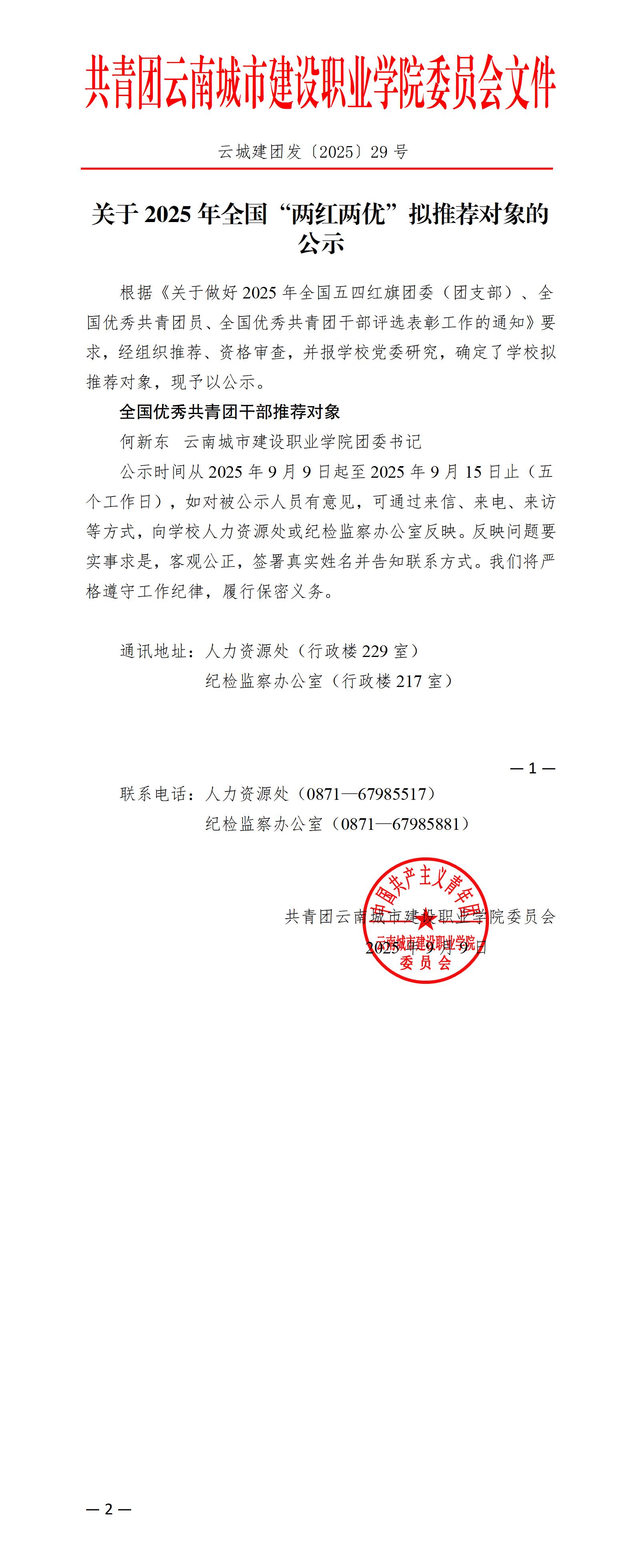 云城建团发〔2025〕29号 关于2025年全国“两红两优”拟推荐对象的公示