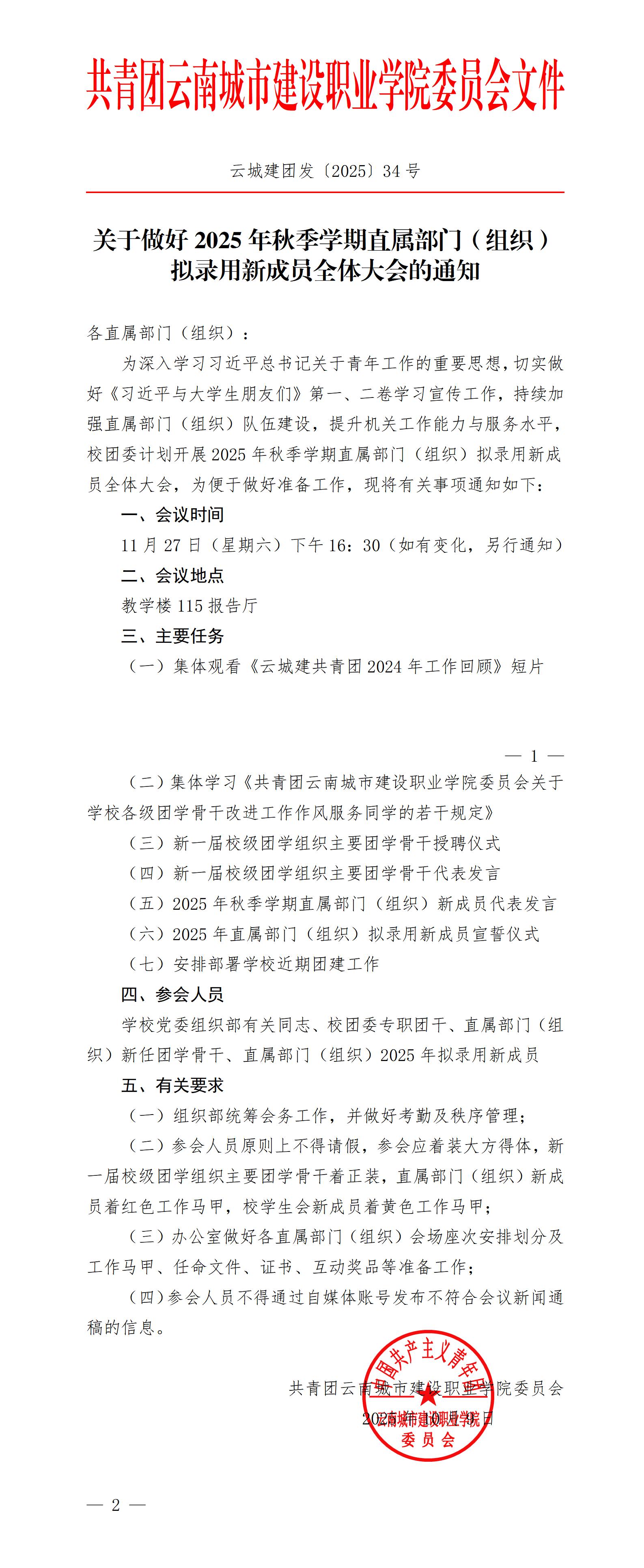 云城建团发〔2025〕34号 关于做好2025年秋季学期直属部门(组织)拟录用新成员全体大会的通知