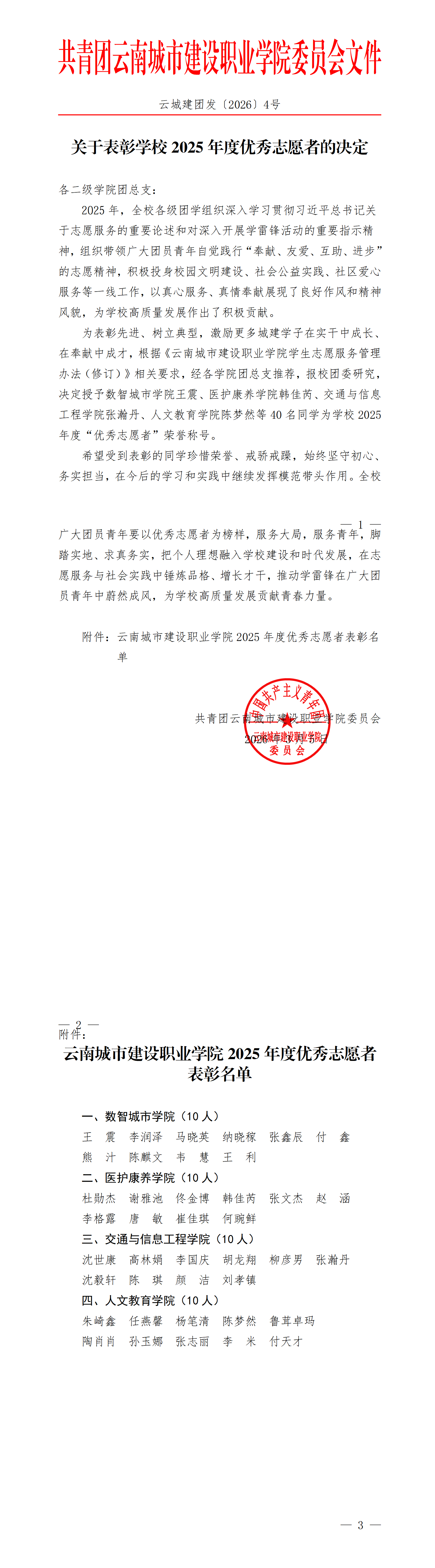云城建团发〔2026〕4号 关于表彰学校2025年度优秀志愿者的决定