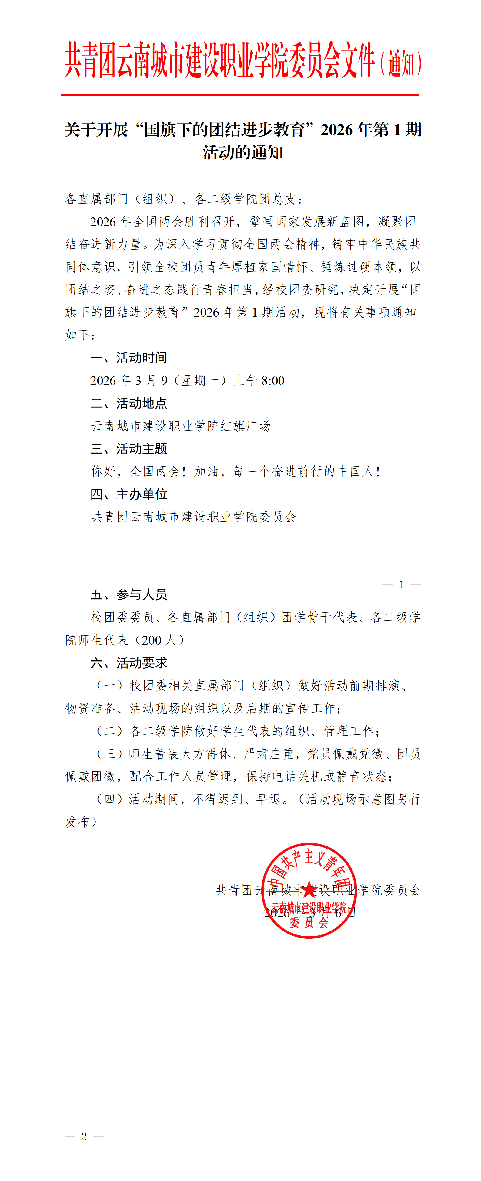 关于开展“国旗下的团结进步教育”2026年第1期活动的通知