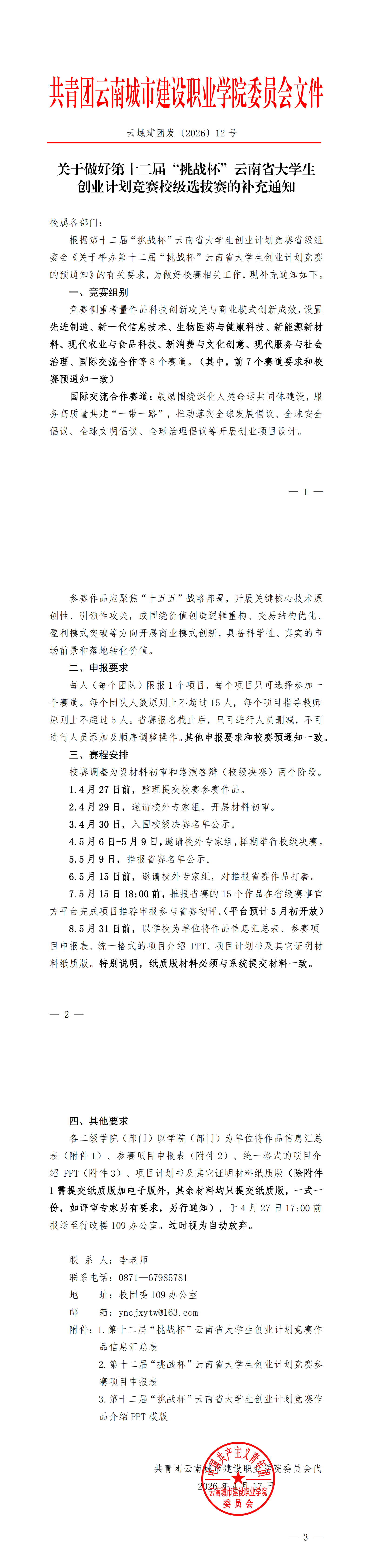 云城建团发〔2026〕12号 关于做好第十二届“挑战杯”云南省大学生创业计划竞赛校级选拔赛的补充通知